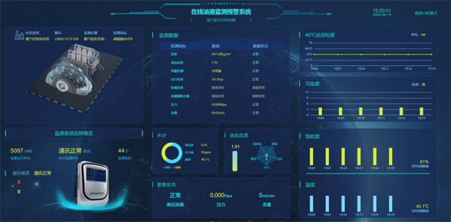 該系統(tǒng)由安裝在現場的監(jiān)測傳感器、數據處理及傳輸系統(tǒng)、數據分析診斷平臺等組成,具備實時采集油溫、含水量、運動黏度、金屬磨粒、顆粒污染度等質量指標功能。