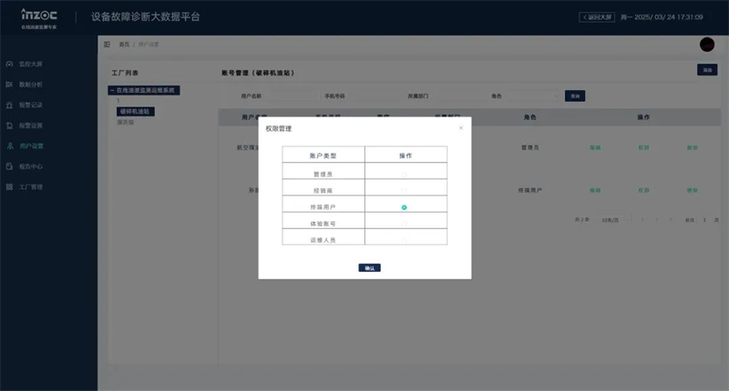 ■ 用戶設(shè)置權(quán)限分級:主要分為管理員、經(jīng)銷商、終端用戶、體驗(yàn)賬號、運(yùn)維人員五大賬戶類型,實(shí)現(xiàn)專機(jī)專管,靈活分配設(shè)備管理權(quán)限。