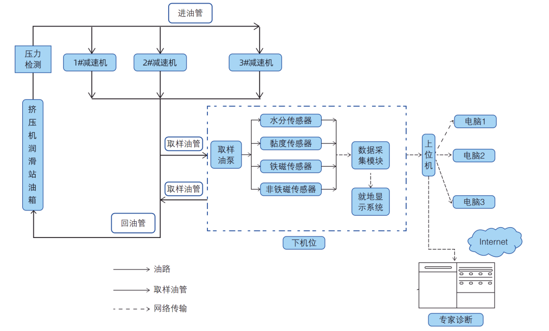 ▲擠壓機(jī)潤滑系統(tǒng)的油液在線監(jiān)測系統(tǒng)原理