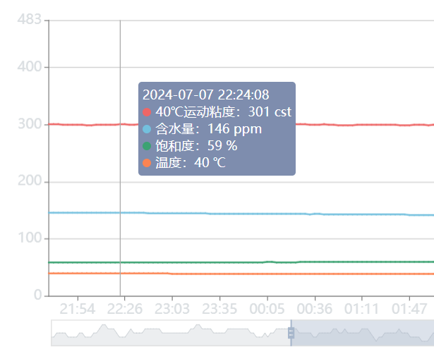 通過人機(jī)界面可以直觀查詢?nèi)?0 ℃黏度、實(shí)時黏度、油溫、水分、鐵磁顆粒、非鐵磁顆粒等數(shù)據(jù)的歷史曲線。