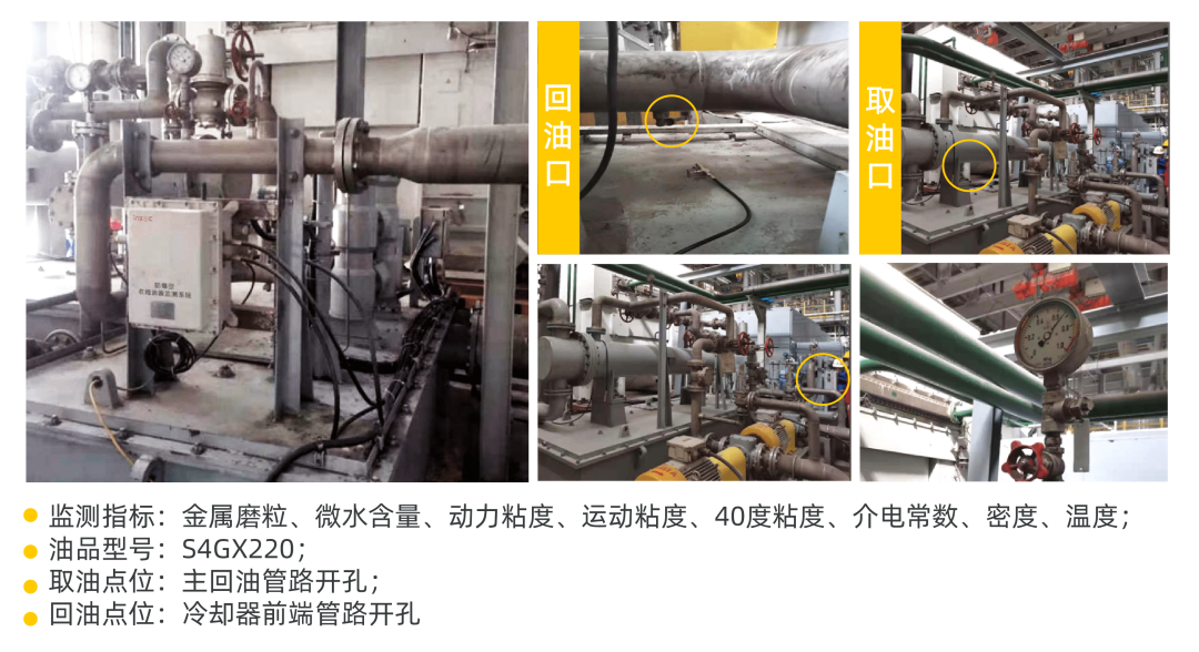 監(jiān)測裝置采用支架安裝,選取擠壓機(jī)潤滑站的主回油管路開孔,作為監(jiān)測油液系統(tǒng)的油液取樣口,同時也在冷卻器前端管路開孔,形成一條回油支路,形成閉環(huán)整個油路系統(tǒng),實(shí)現(xiàn)24h無間斷的油液采集監(jiān)測。
