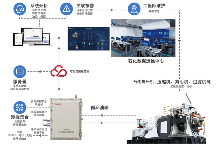 基于物聯(lián)網(wǎng)油液云平臺,結(jié)合減速機(jī)常見齒輪和軸承故障特點(diǎn),智火柴為擠壓機(jī)打造出一套智能故障診斷與油質(zhì)在線監(jiān)控預(yù)警解決方案,填補(bǔ)了石化領(lǐng)域擠壓機(jī)關(guān)鍵部件在油質(zhì)在線監(jiān)測運(yùn)維技術(shù)的空白。