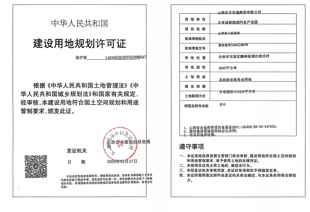 根據有關規定,現對比亞迪新能源汽車產業園項目用地規劃許可批后公開,具體內容如下: