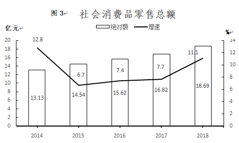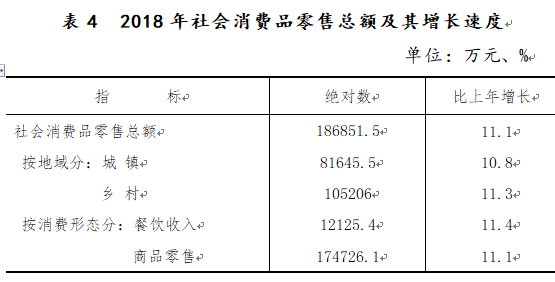 全年全區社會消費品零售總額186851.5萬元,增長11.1%。其中,城鎮消費品零售額81645.5萬元,增長10.8%;鄉村消費品零售額105206萬元,增長11.3%。