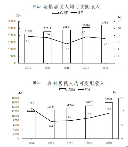全年農村居民人均可支配收入16109元,比上年增長9.4%;城鎮居民人均可支配收入27524元,比上年增長7.1%。