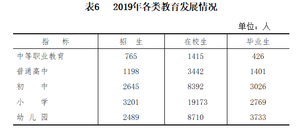 全區完全中學1所、高級中學1所、職業中學1所、普通初中8所(其中:含民辦1所)、九年一貫制學校1所、十二年一貫制學校1所、普通小學100所(含67個教學點)、獨立設置幼兒園96所(其中民辦幼兒園52所、企辦幼兒園1所)。全區中小學有教職工2684人,其中專任教師2328人。全區在校普通高中生3442人;職中1415人;普通初中在校生8392人(其中:寄宿生5597人),小學在校生19173人(其中:寄宿生6001人);在園幼兒8710人(其中民辦幼兒園人數3903人,普惠性民辦幼兒園864人,企辦幼兒園人數572人)。其他教育單位教職工數145人,其中教育科技局機關83人,電教館25人,教師進修校33人,青少年活動中心4人。