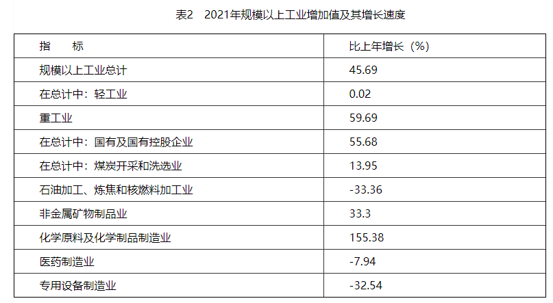 2021年末全區規模以上工業企業48家。全年規模以上工業增加值增長45.69%。其中,輕工業增加值增長0.02%;重工業增加值增長59.69%。