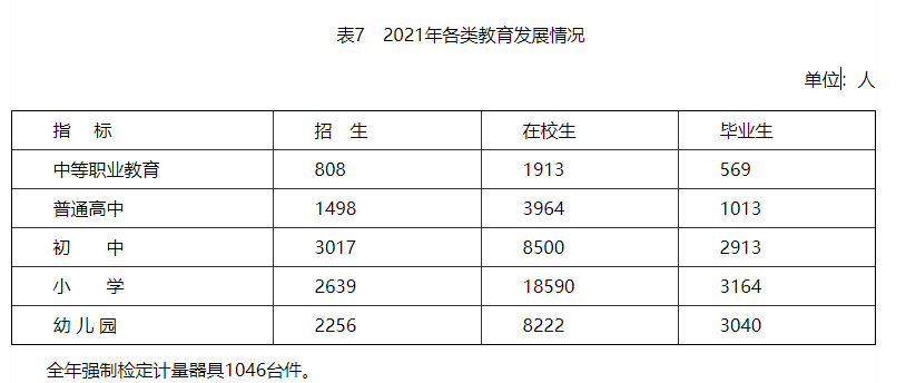 全區完全中學1所、高級中學1所、職業中學1所、普通初中9所(其中:含民辦1所)、九年一貫制學校2所、十二年一貫制學校1所、普通小學97所(含65個教學點)、獨立設置幼兒園87所(其中民辦幼兒園44所、企辦幼兒園1所)。全區中小學有教職工4323人,其中專任教師3561人。全區在校普通高中生3964人;職中1913人;普通初中在校生8500人(其中:寄宿生5484人);小學在校生18590人(其中:寄宿生5378人);在園幼兒園8222人(其中民辦幼兒園人數3887人,普惠性民辦幼兒園1698人,企辦幼兒園人數461人)。其他教育單位教職工數127人,其中教育局機關75人,電教館22人,教師進修校26人,青少年活動中心4人。